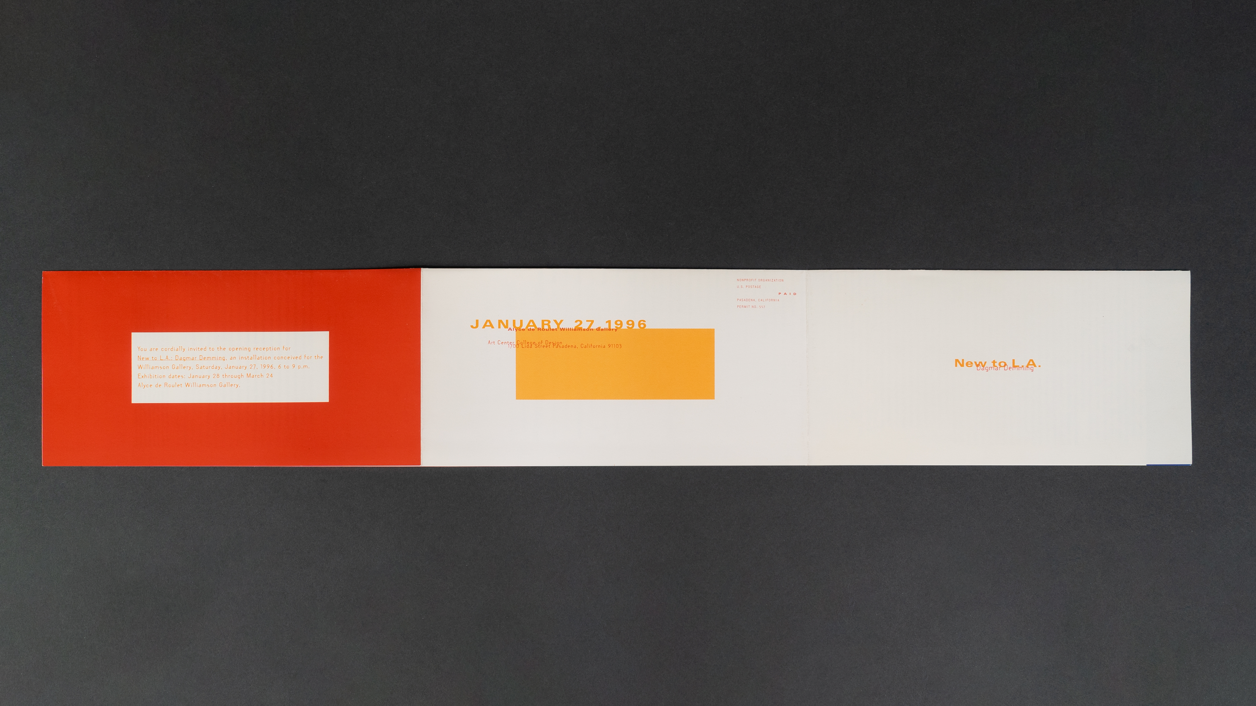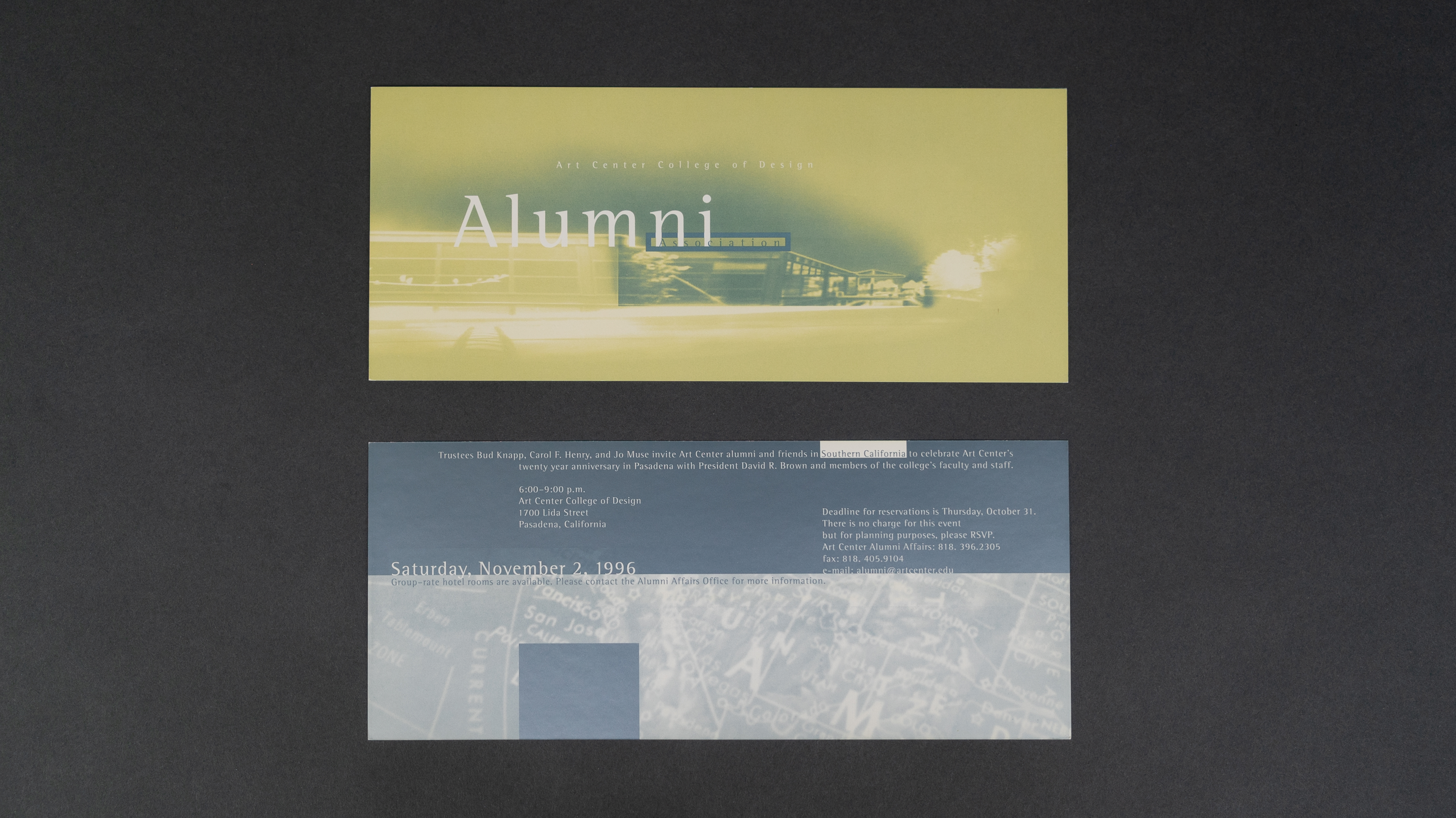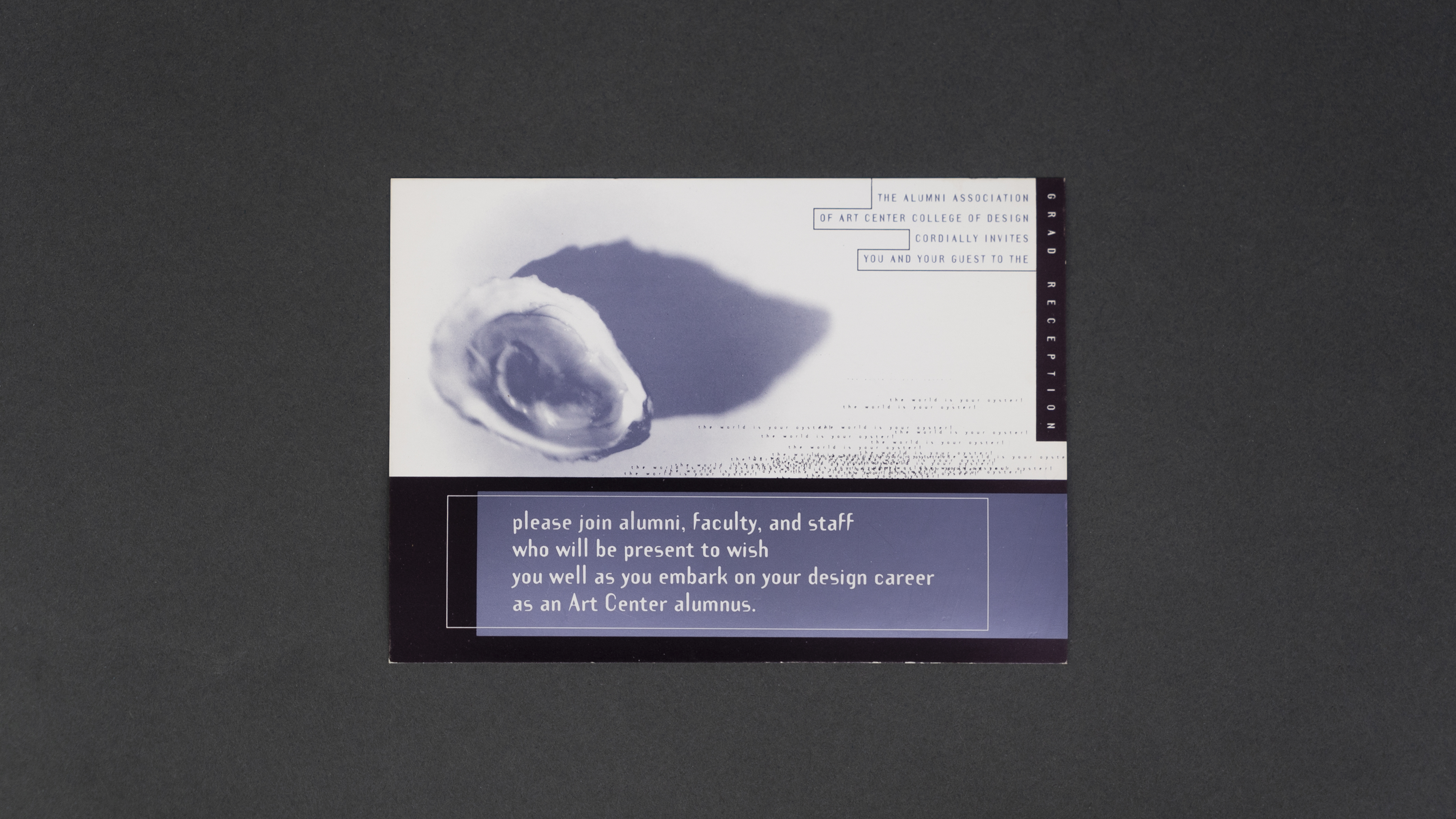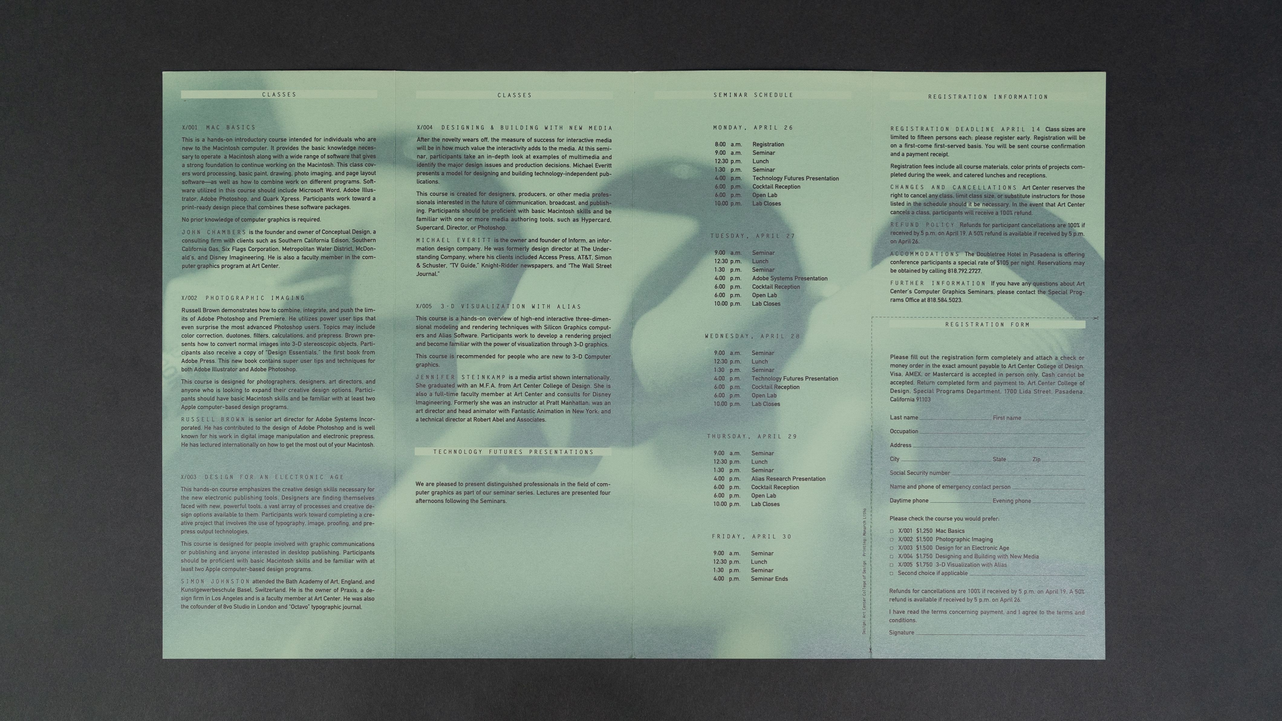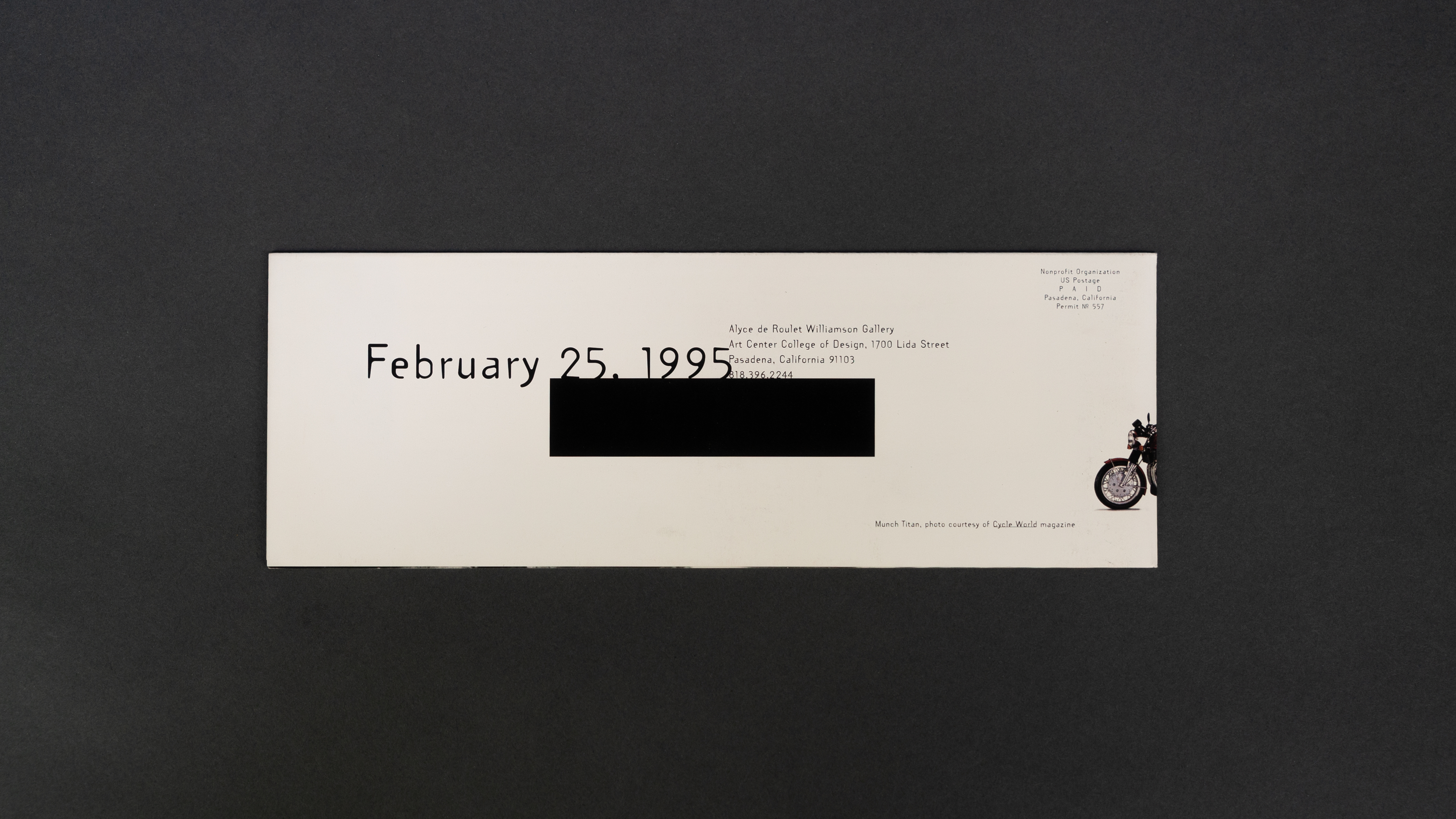With the support of Stuart Frolick, Art Center vice president and creative director, Méndez and her staff designed and produced more than 300 ‘transitional’ projects a year–from recruitment brochures to campus signage. The college’s 1995–96 catalog, a 230-page book bisected horizontally by a systematic perforation, culminated what had been for her and the school a process of mutual self-discovery. “We randomly distressed certain elements of the typography so that it’s fluidity would be revealed,” she says. “The idea of a reconfigured book that could be split and broken emerged when we realized our ambivalence toward print in general, and books in particular.”