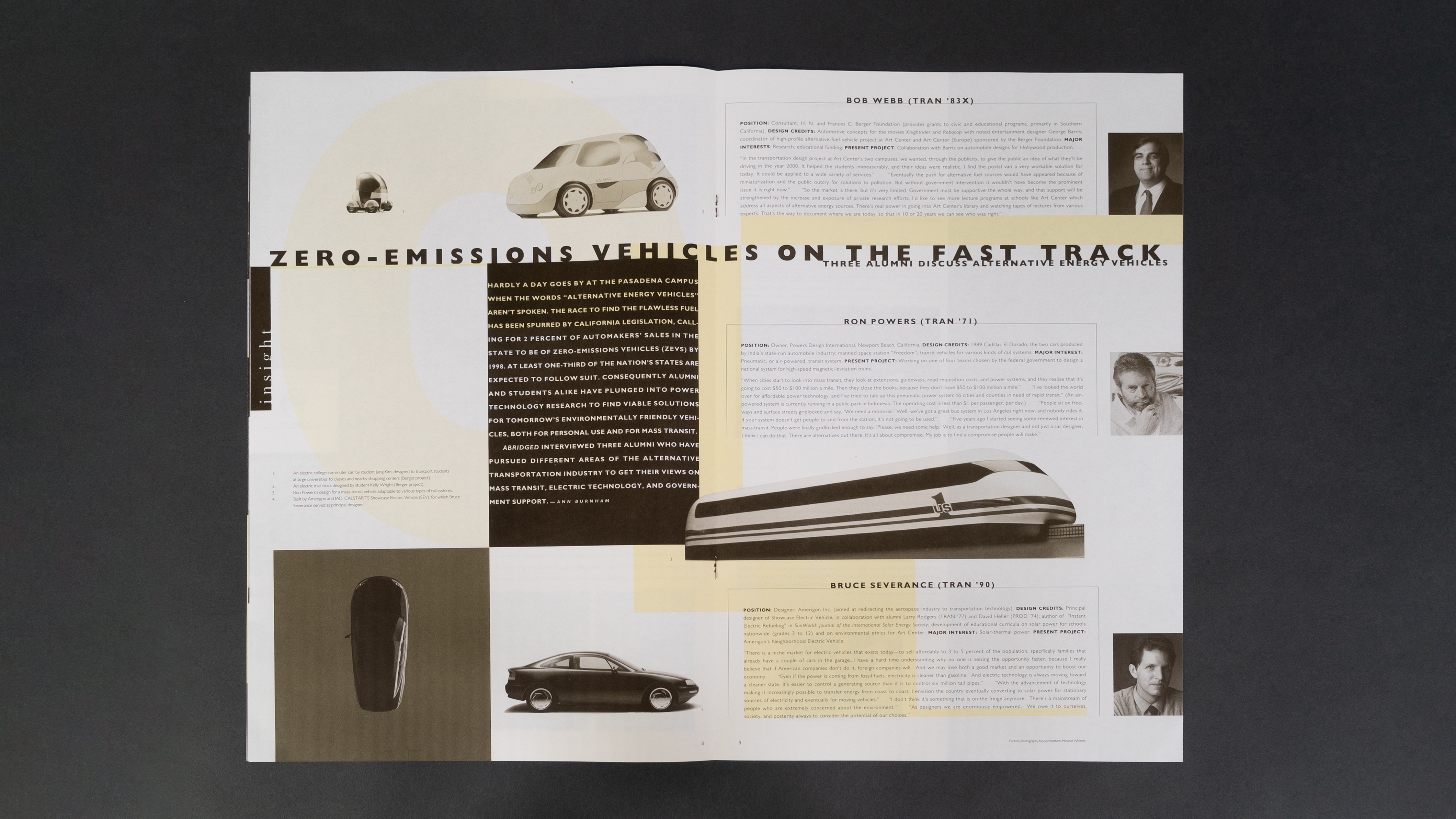 Inspired by French philosopher Henri Bergson, who she discovered through the writings of Gilles Deleuze, Méndez wants her work to be about two directions of representations: that of perception which puts us at once with matter (located in space), and that of memory which puts us at once into mind (in duration). Her layouts are always in the state of becoming, displaying what she describes an an initial dissociation of this mixture of space and time, giving back to each its natural purity, and of their coexistence in the creation of change. But it is with a vengeance that she blurs the boundaries between time and space. There is something almost feral about the way she tears and scatters visual elements on a page. Reflecting the fact that Art Center, its student body and design in general were in a state of transition, she established for the school a fractured, hybrid and deliberately non-linear visual language. “Out of this world of abstraction and virtuality, I created an identity for Art Center, and in turn, this identity created me,” she says. “It was both incestuous and frightening.”