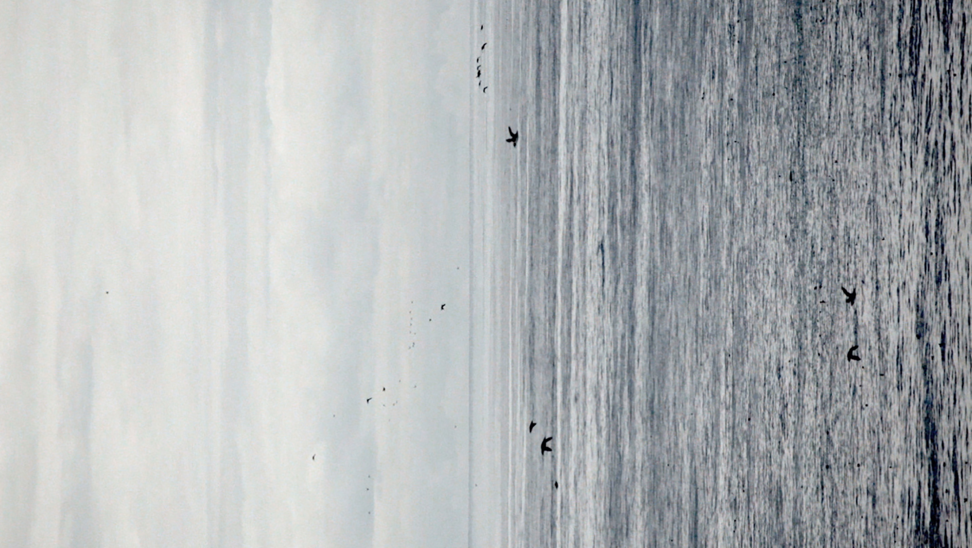 Formally, the video image is experienced vertically, defamiliarizing the seascape, so that the boundary dividing sea and sky becomes unstable and blurred. The spatial shift, together with a low video frame rate furthers this abstraction so we may understand the migratory impetus as code; a genetic code for evolutionary preservation. With this work, I reflect on how we as human species no longer have an understanding of our place within the greater scheme of life.