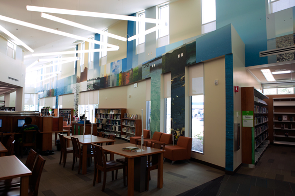 CircumSolar, Migration 2, 2013; public art, fire retardant canvas and ink; 132 feet long x 25 feet high, ~1,250 square feet approximately. Installation view at the Pico Rivera Public Library.