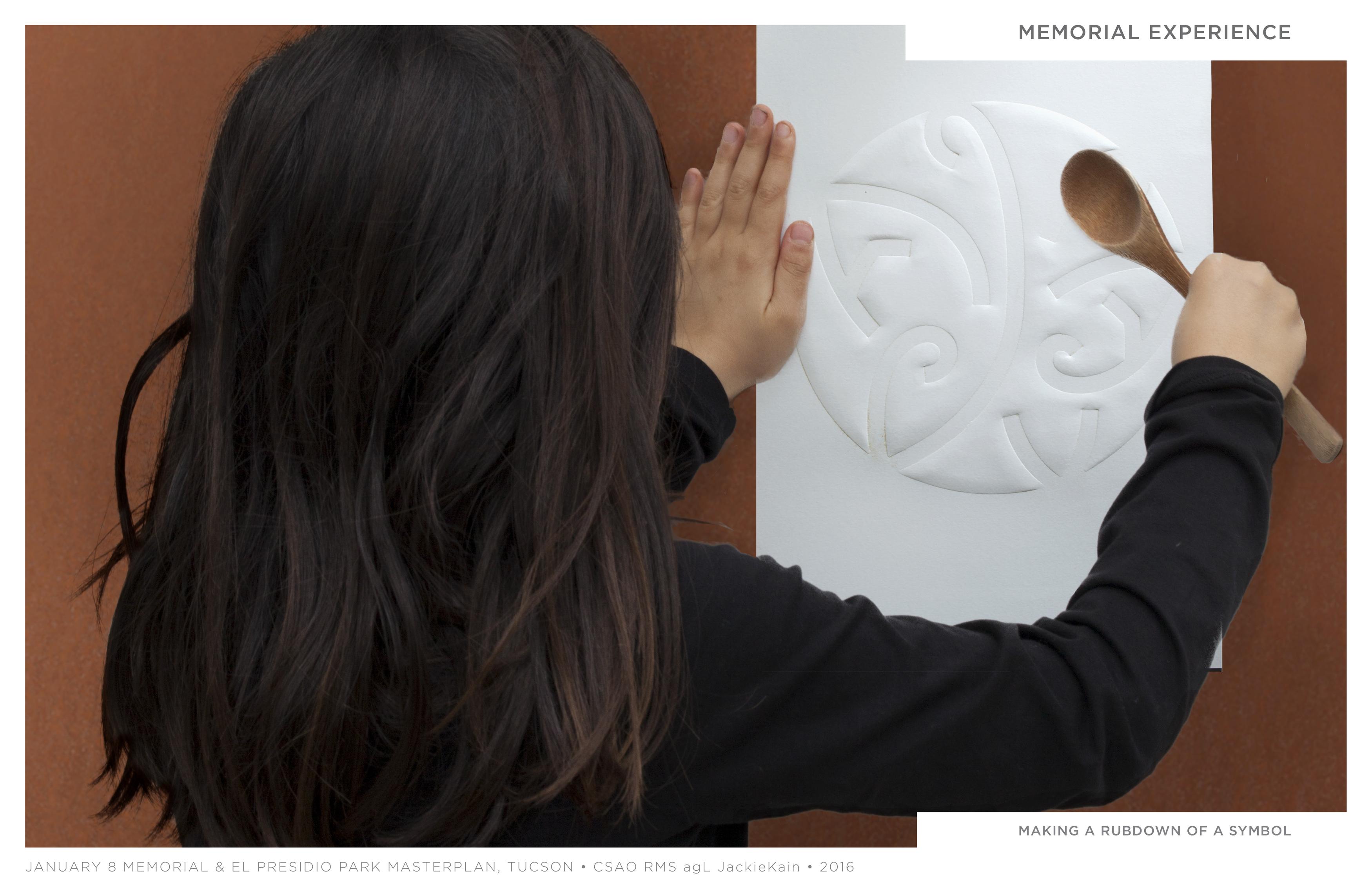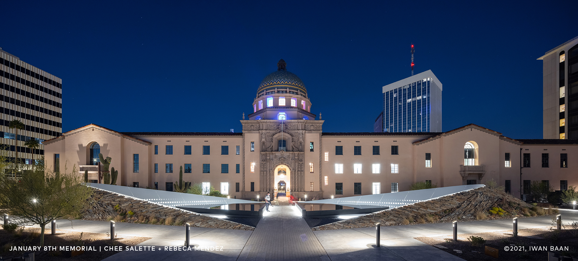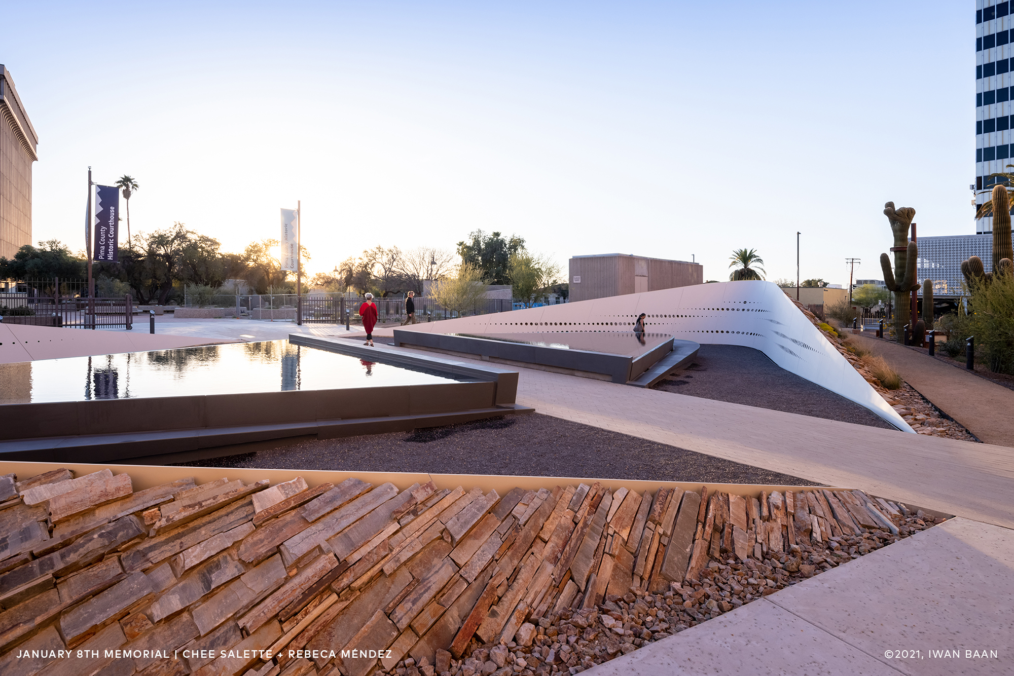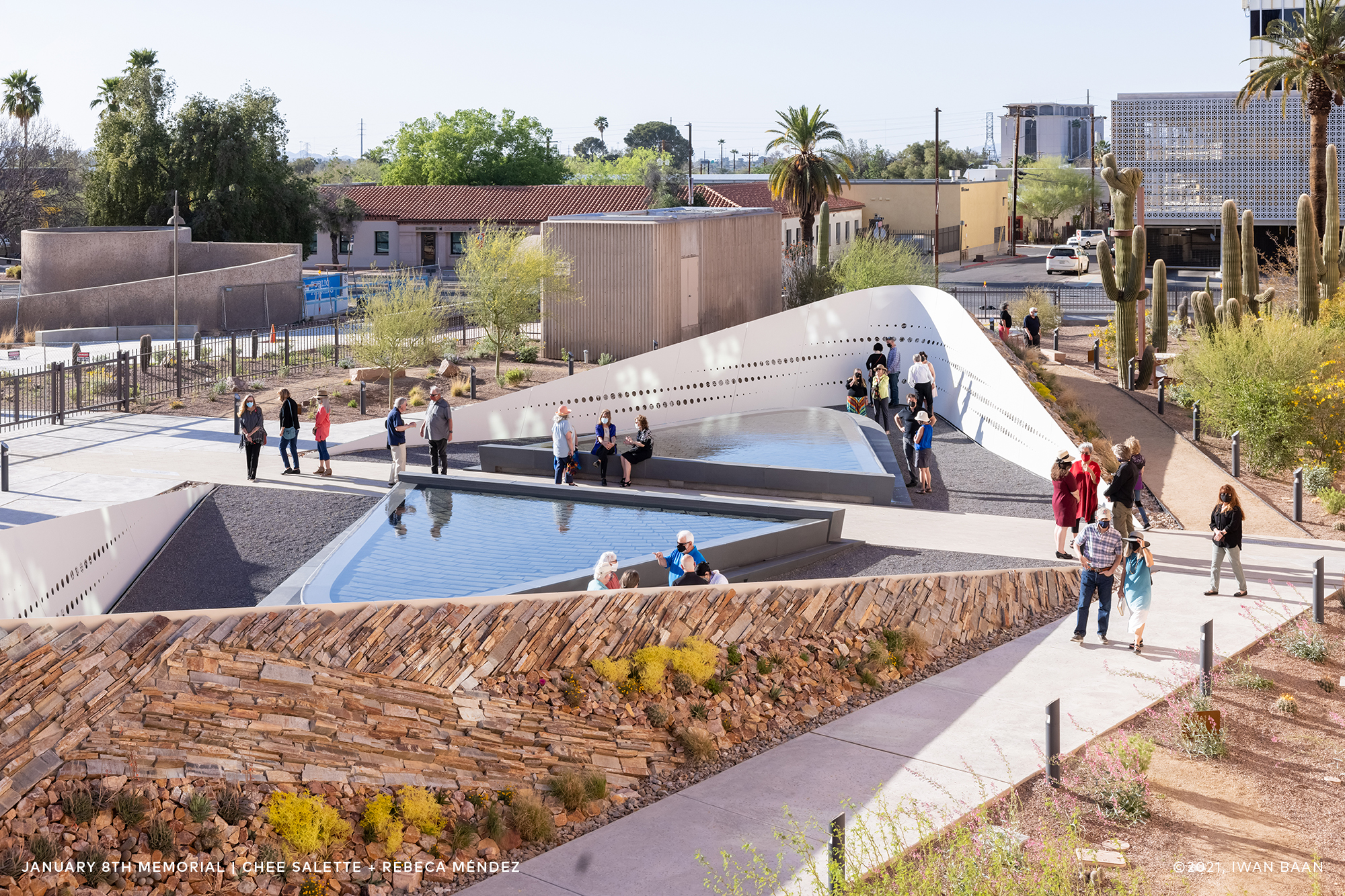 Honoring the victims and survivors of the 2011 shooting at then Representative Gabrielle Giffords’ “Congress on your Corner.” The Memorial is an embrace. In a single gesture, its landforms become healing arms protecting the inner memorial, where the story of January 8th is told. Carved into the landscape of El Presidio Park, the Memorial is a place of contemplation and reflection where visitors can honor the victims and survivors of this tragic event, who were there to engage in democracy, and the first responders who stopped the violence and saved lives. Symbols telling this story are cut into this collective wall of memories, forming constellations that speak of the people who died, survived and responded on that day, and recall Tucson’s history of resilience. In the surrounding gardens, the earthforms of the Living Wall protect the Memorial. It evolves over time and changes with the seasons, yet it is timeless and spans generations, an organic landscape of stone and plants woven in a pattern that evokes ancient basket weaving. People plant seeds in its crevices, where life takes root, a celebration of Tucson’s togetherness in the face of tragedy, and a manifestation of the healing of its community.