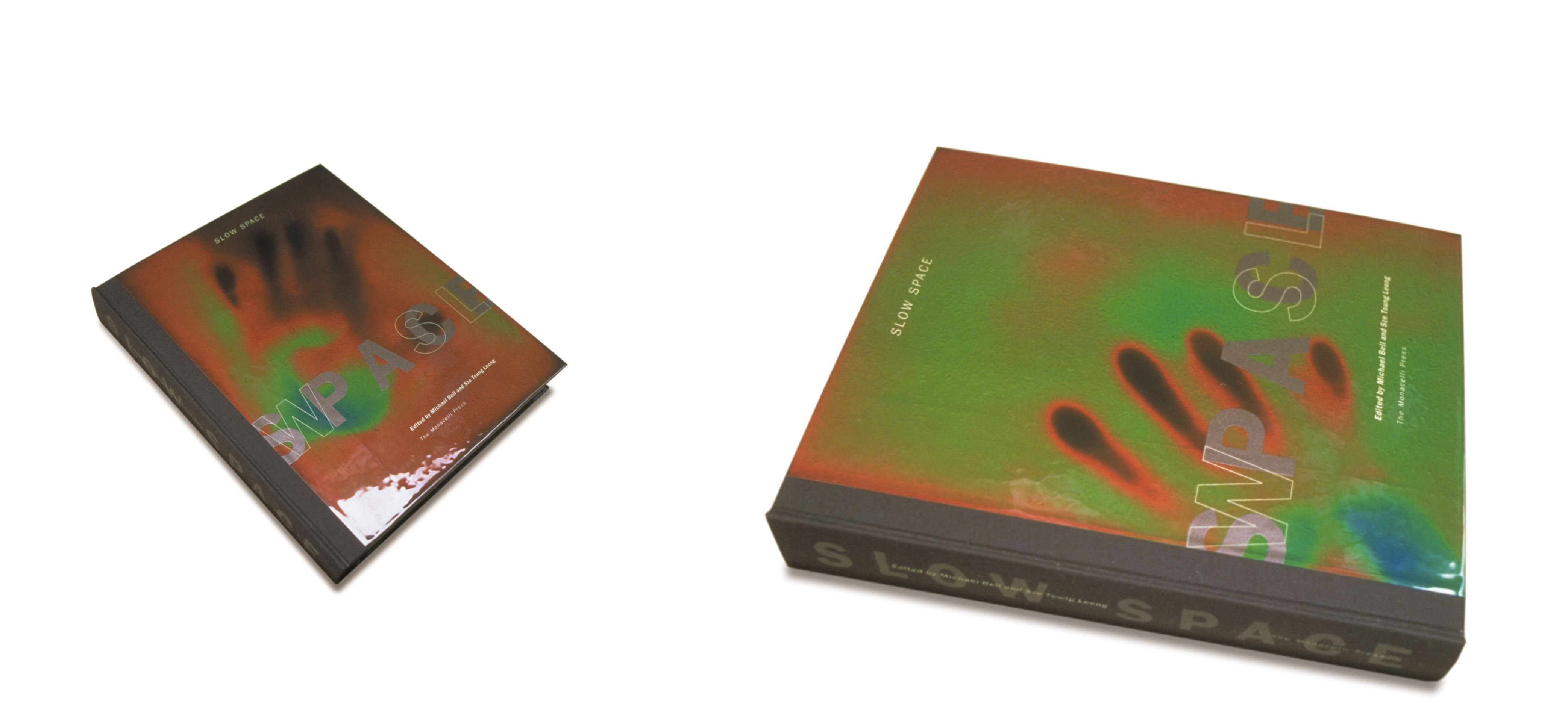 Slow Space is a collection of essays and works of architecture, whose primary focus is in delineating a possible scenario for an authentic architectural experience by an affirmation of a durational model of both time and the city-the reassertion of matter as a delay. The (unpublished) hard cover is covered with heat sensitive material, proving a perfect amalgam to the concept of Slow Space. When touched and held the material leaves an imprint caused by the heat of the hand, only slowly fading away in time. For the soft cover design, through the use of sense of instability, addressing the primary idea of the books contect: matter a delay.