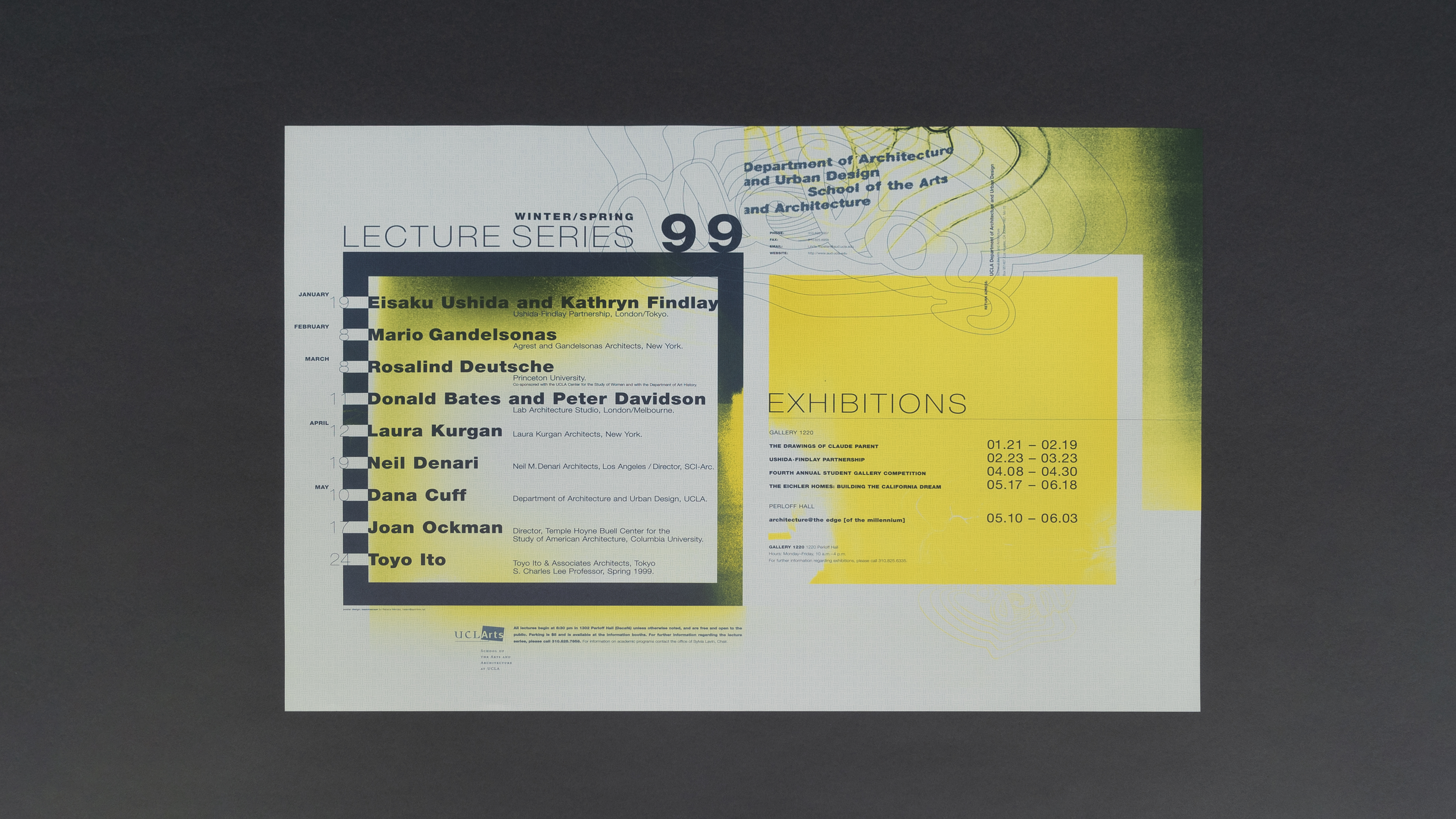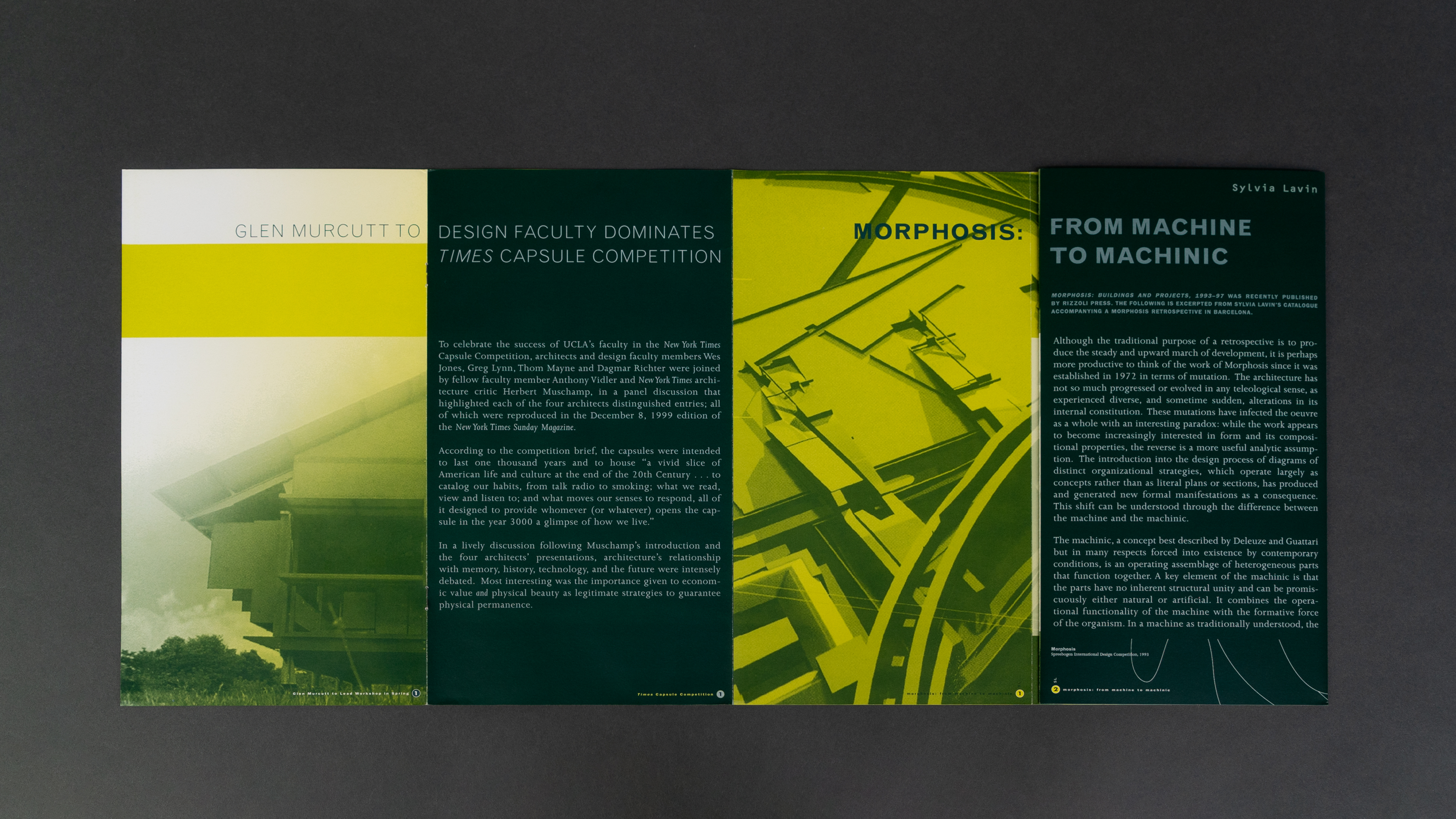 The design solution jumped from the preoccupations of chair Silvia Lavin and those in late twentieth-century architectural theory and design, revolving around the issue of time and architecture. Lavin understood that her communications would express the vision for the department and we both pushed the industry standards to their limits to express ‘matter as time.’ We were both inspired by the words of architect Greg Lynn, professor at UCLA Architecture, who writes in his book Animate Form: “... Instead of simulating flow and continuity through the addition of motion as in traditional cinematic techniques, animation suggests animalism, animism, evolution, growth, actuation, vitality and virtuality.”