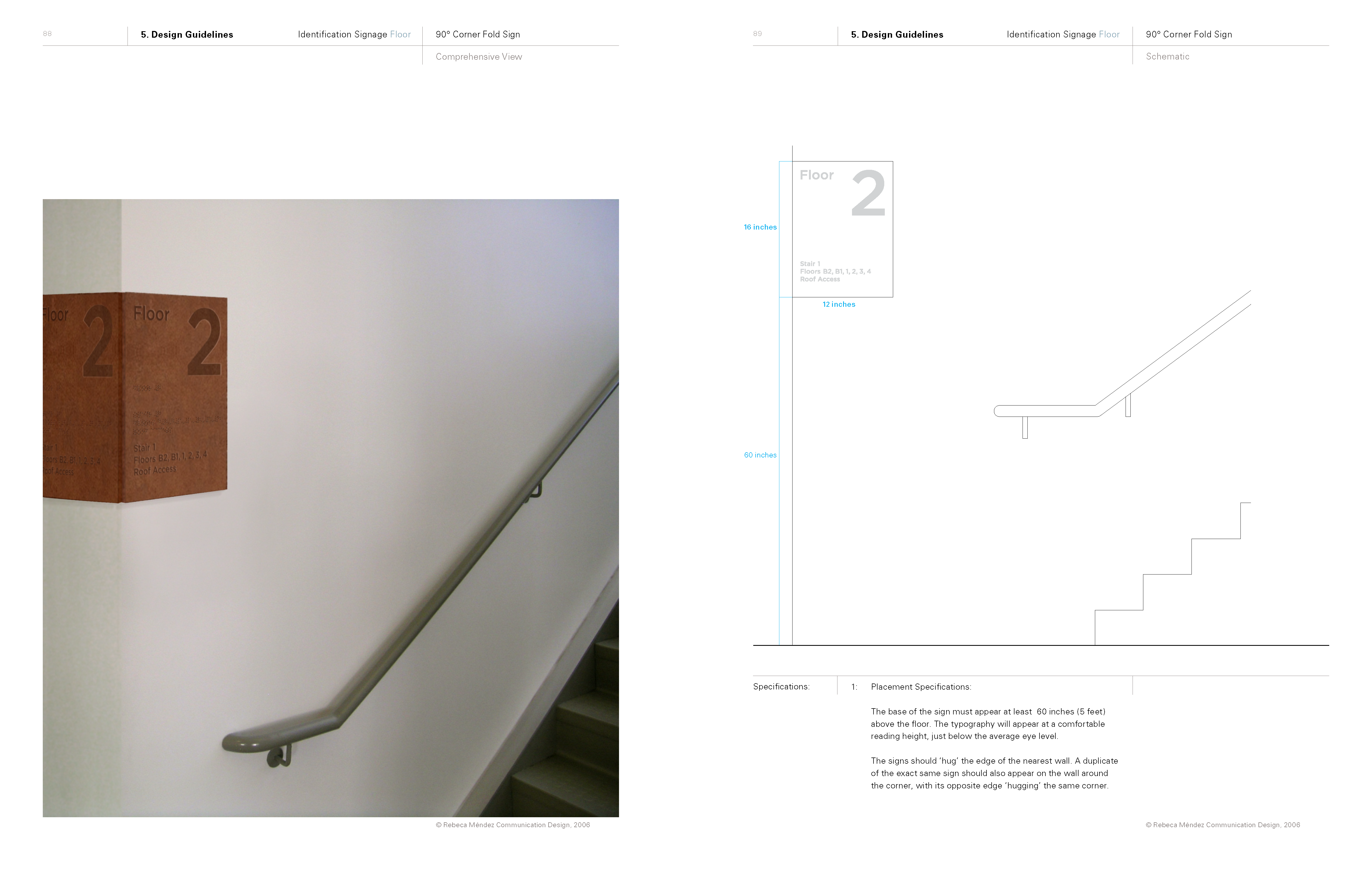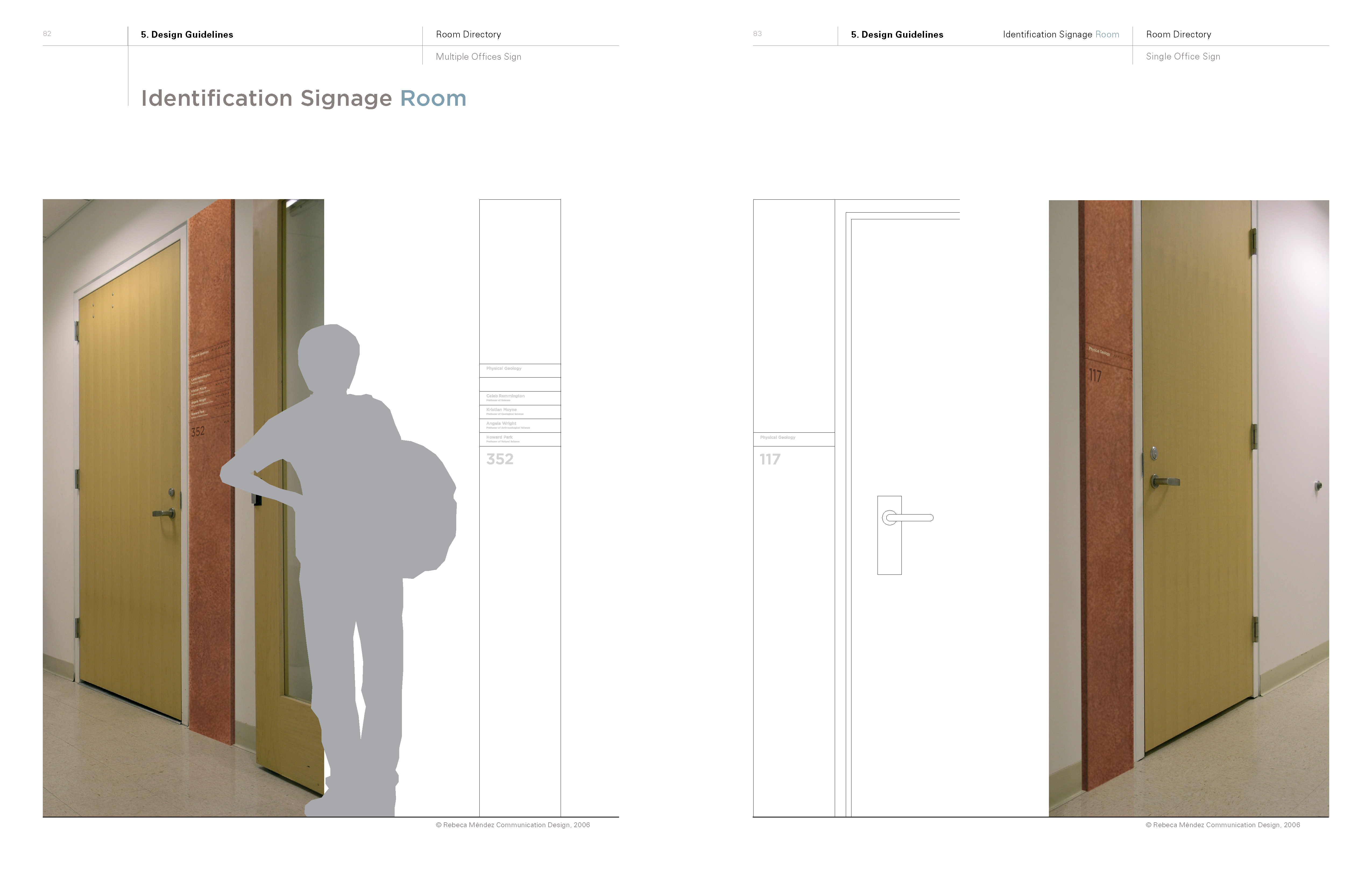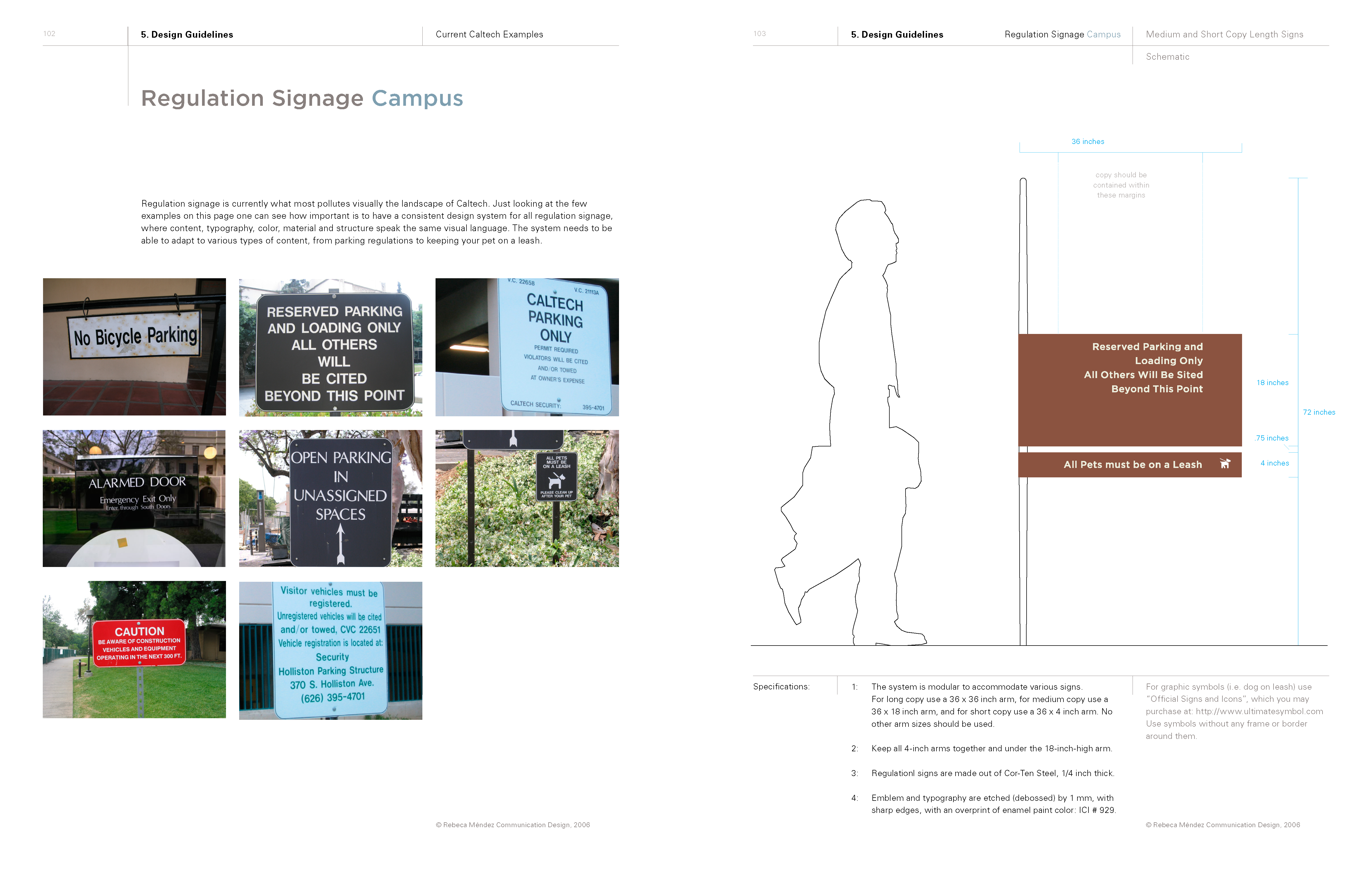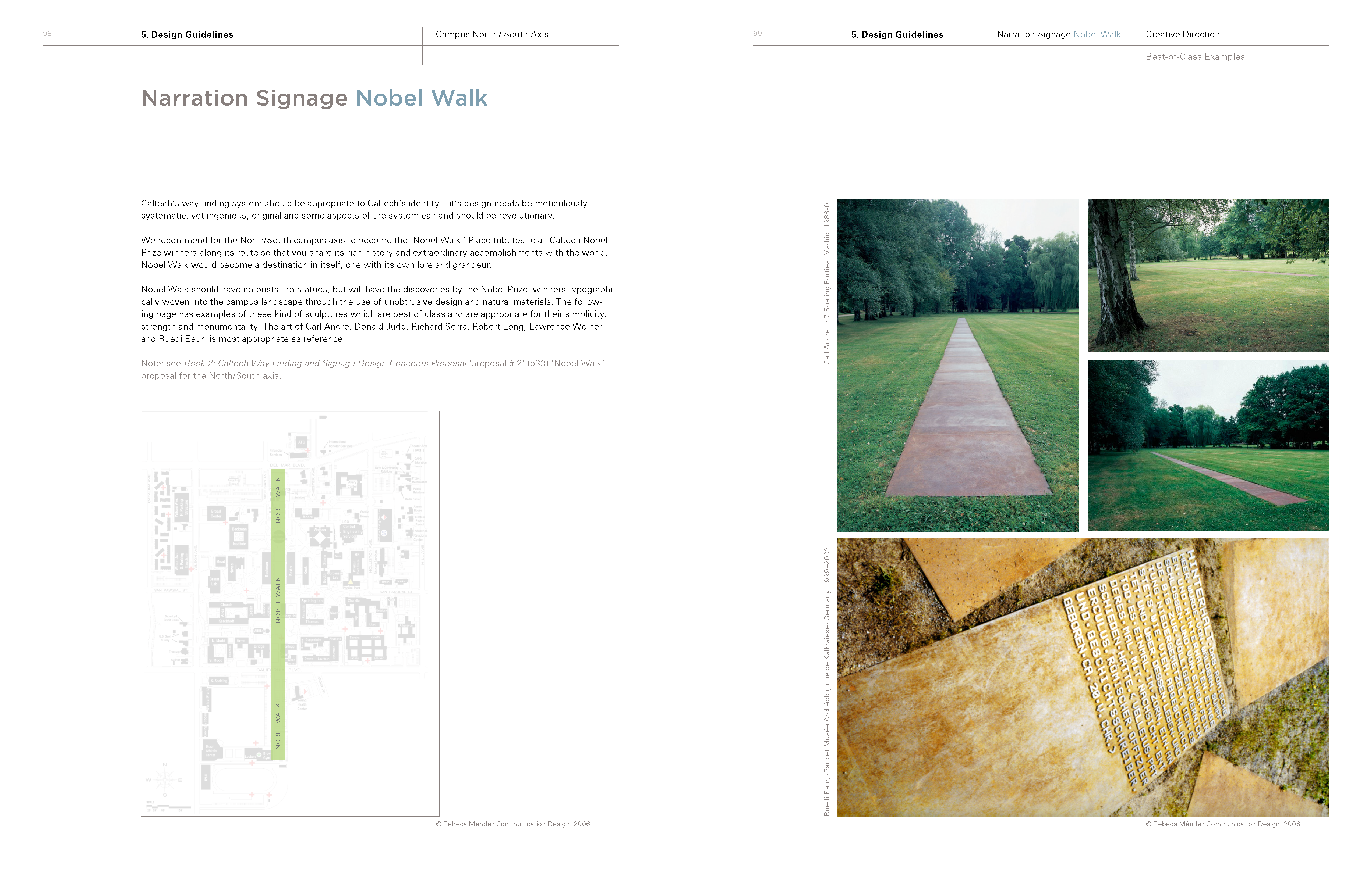 The scope of work was presented in three books. In August 2005 RMD presented its way-finding research findings in the report Book 1: Serenity, Lost and Found to CRP, in October 2005. RMD presented to the Board of Trustees at Caltech Book 2: Caltech Way-Finding Design Concepts Proposal, which was both a summary of the research phase and a presentation of design solutions. In April 2006 Book 3: Caltech Way-Finding and Signage Guidelines was completed and delivered to CRP. The images that follow are selected pages from book 3—a 110 page document.
